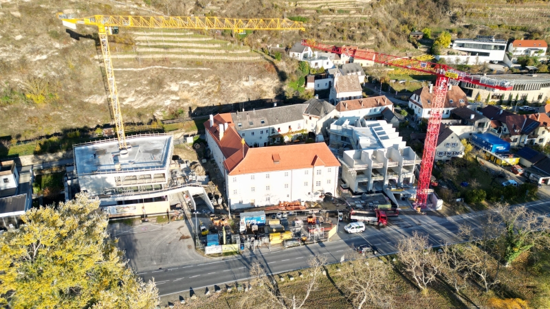 Links und rechts des historischen, denkmalgeschützten Ansitzes, in welchem nach der Renovierung Restaurant, Bar und Vinothek untergebracht sein werden, entstehen zwei neue Gebäudeteile, die später insgesamt 60 Hotelzimmer beherbergen.